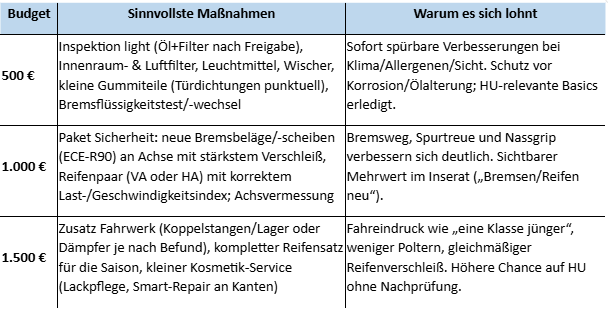 Ein gezielter 1.000-Euro-Refresh zahlt sich bei älteren Gebrauchten gleich dreifach aus. Er erhöht die Chancen auf einen besseren Verkaufspreis, steigert unmittelbar die Fahrsicherheit und verlängert die Lebensdauer wichtiger Komponenten.